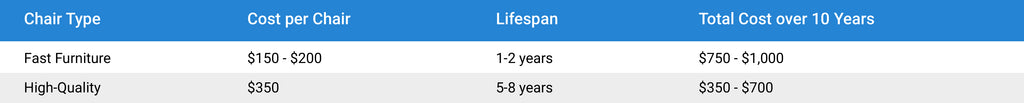 - A chair costing between $150 and $200 might last you 1 to 2 years. Over a 10-year period, you could end up purchasing this chair five times, resulting in a total cost of $750 to $1,000.