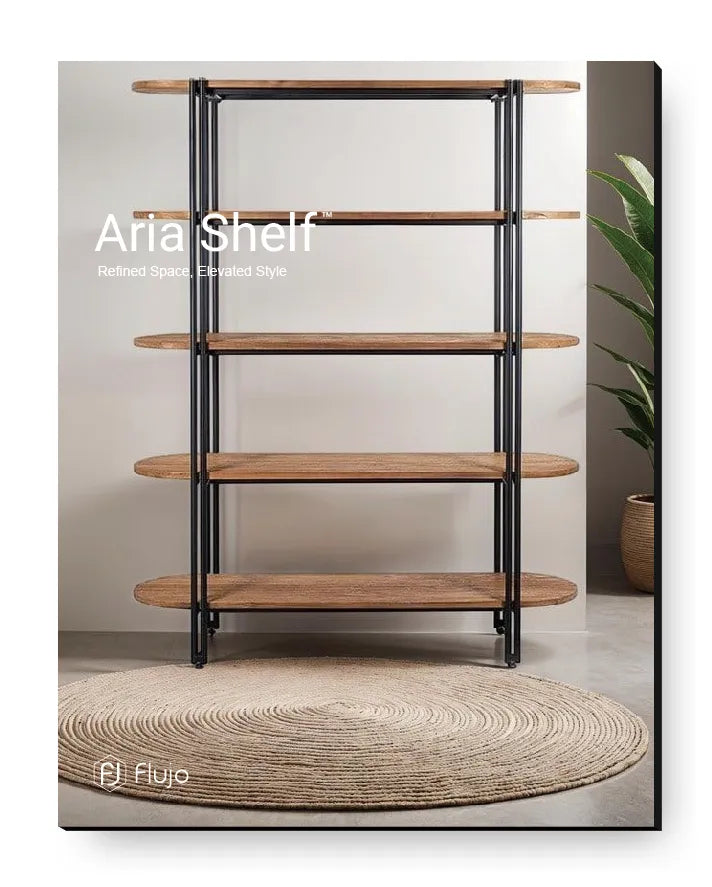 The Flujo Aria Shelf merges contemporary aesthetics with practicality. Featuring elegant circular wood shelves and a sleek metal frame, it enhances both organization and décor.